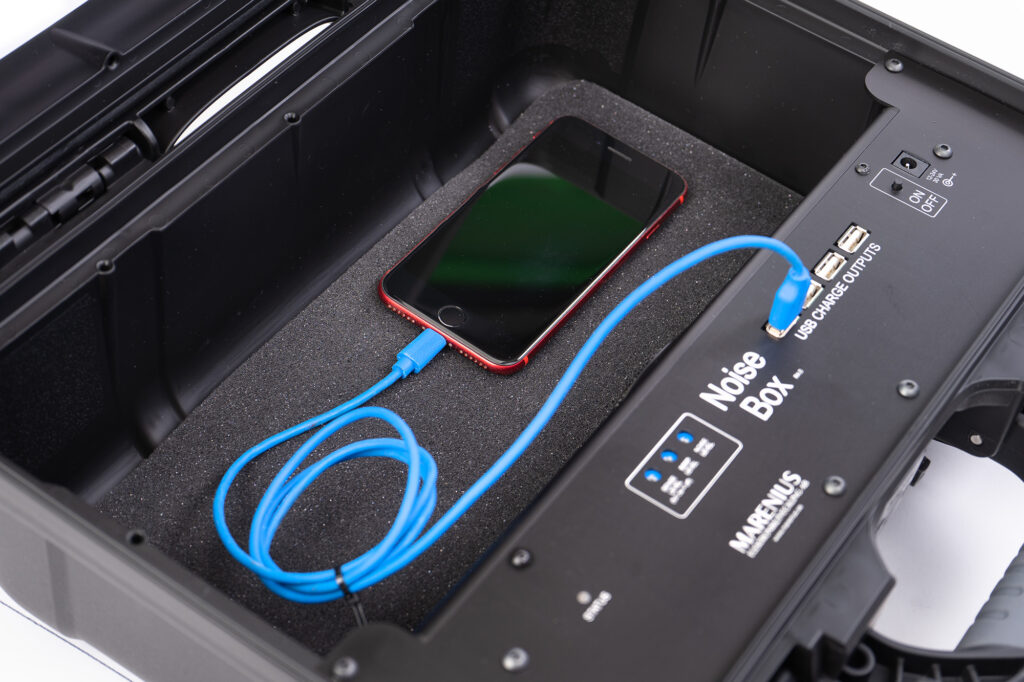 Drücken Sie die Taste im Inneren der NoiseBox, um sie zu aktivieren, und schließen Sie die Telefone bei Bedarf zum Aufladen an die integrierten USB-Anschlüsse an.