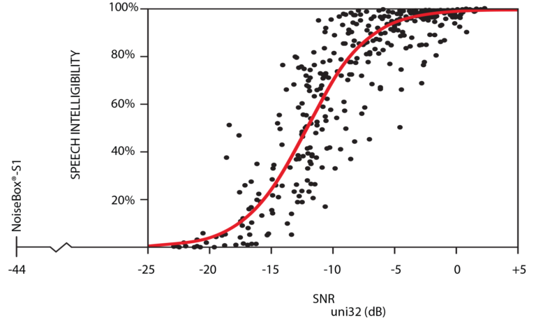 SNRuni32 ist ein Parameter, der mit dem Sprachverständnis verglichen werden kann. Der Parameter ist das Ergebnis einer Studie von Bradley, JS und Gover, BN. Die Forscher fanden heraus, dass ein Wert von -16 dB oder weniger die Schwelle für Sprachverständlichkeit darstellt. Alle NoiseBox®-Geräte liegen unter diesem Wert, und die NoiseBox-S1® und S1+ haben einen Wert von -44 dB, was einen Mithörspielraum von 28 dB bietet